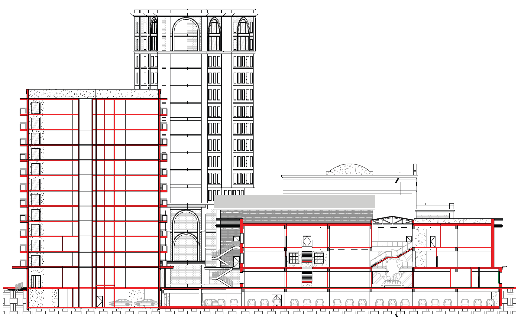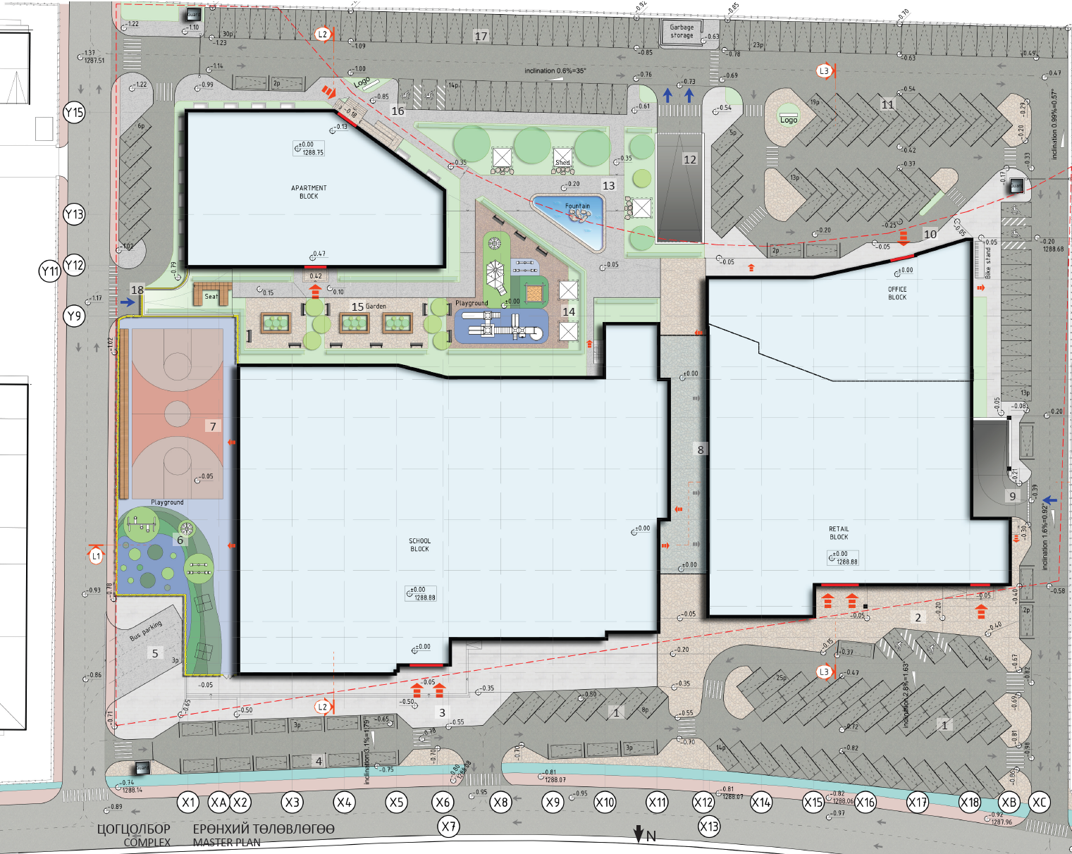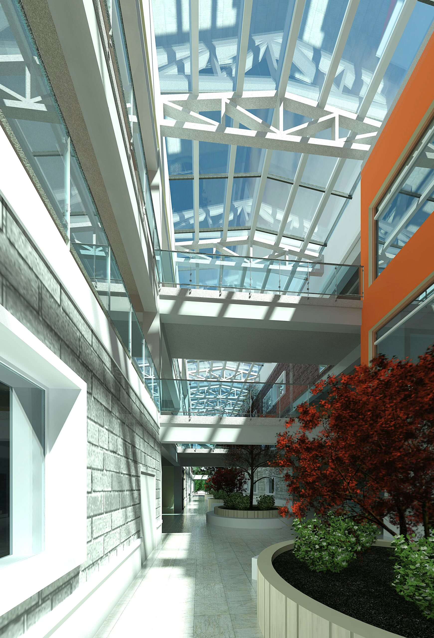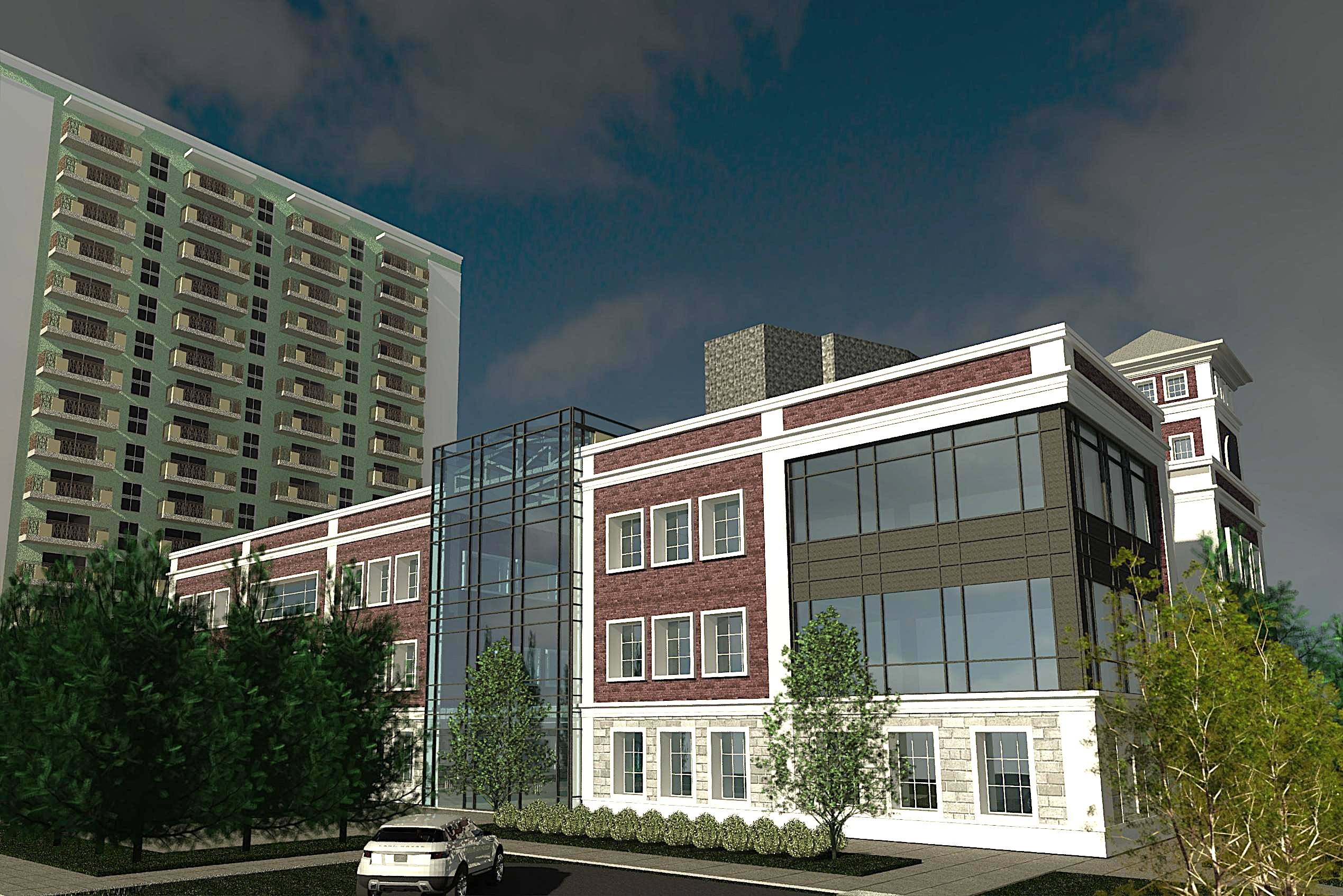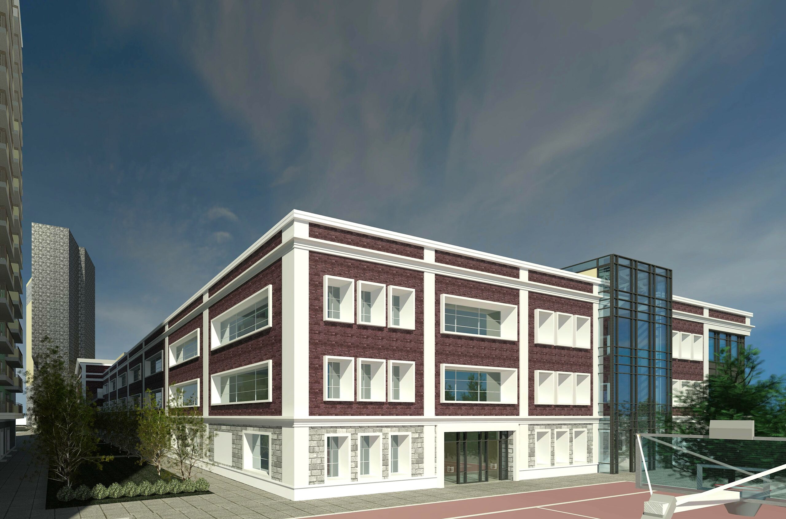 Progetto di riconversione di una area urbana originariamente destinata a centro commerciale con l’inserimento di una torre residenziale (16 piani – ca 18.000 mq), una torre ad uffici (11 piani – ca 6.500 mq), un centro commerciale (ca 6.500 mq), un centro sportivo (ca 2.400 mq) ed una scuola internazionale (ca 8.500 mq) con giardino coperto, mensa ed auditorium per 300 persone ed piano interrato con parcheggio per 350 posti auto.